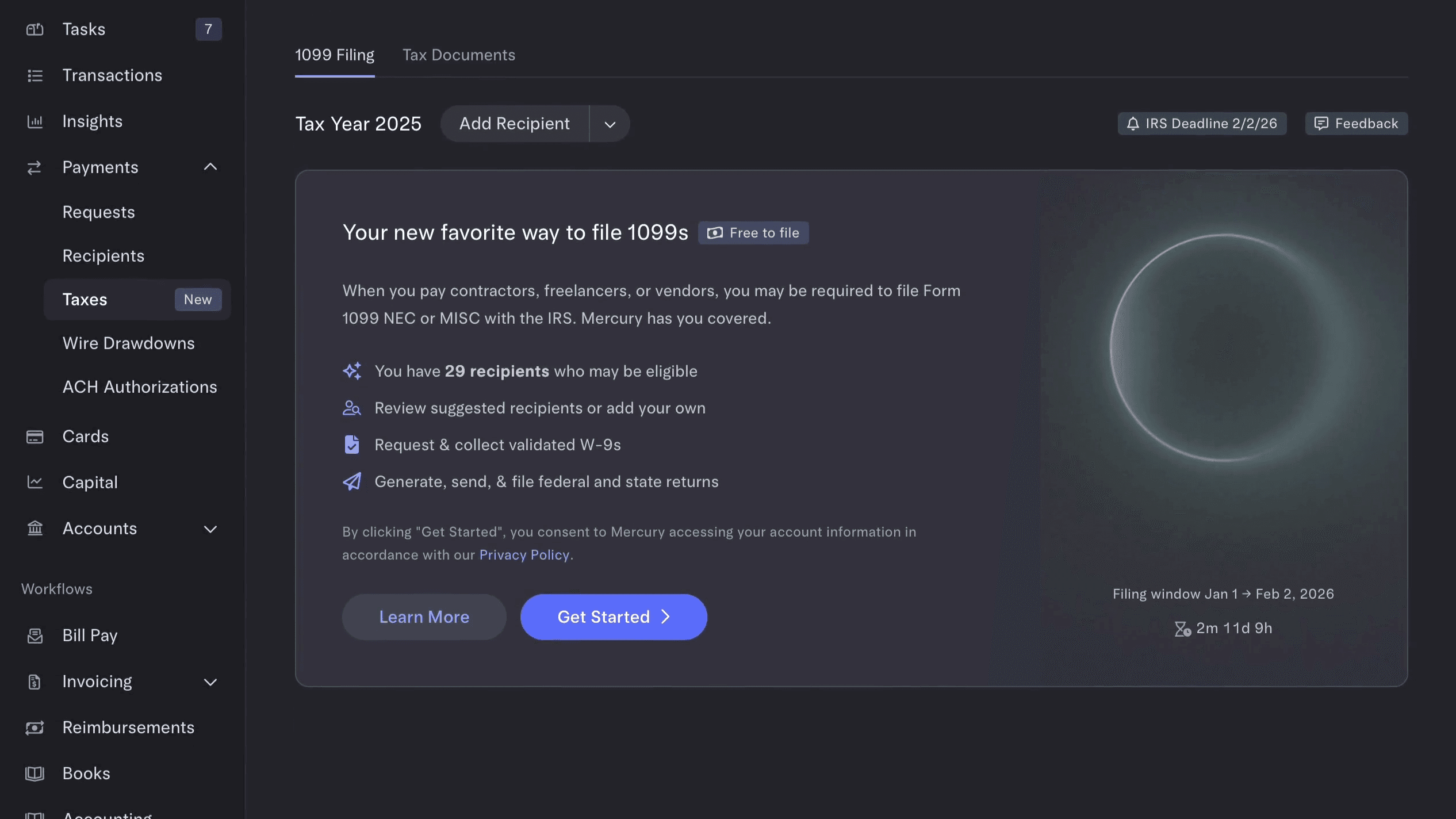 A focused brand and product collaboration highlighting the speed and ease of filing 1099 tax forms through Mercury. Our goal was to distill the efficiency Mercury brings to this complex financial task. By utilizing a branded motif and fast-paced motion, we transformed the concept of tax filing into a dynamic and seamless visual narrative.